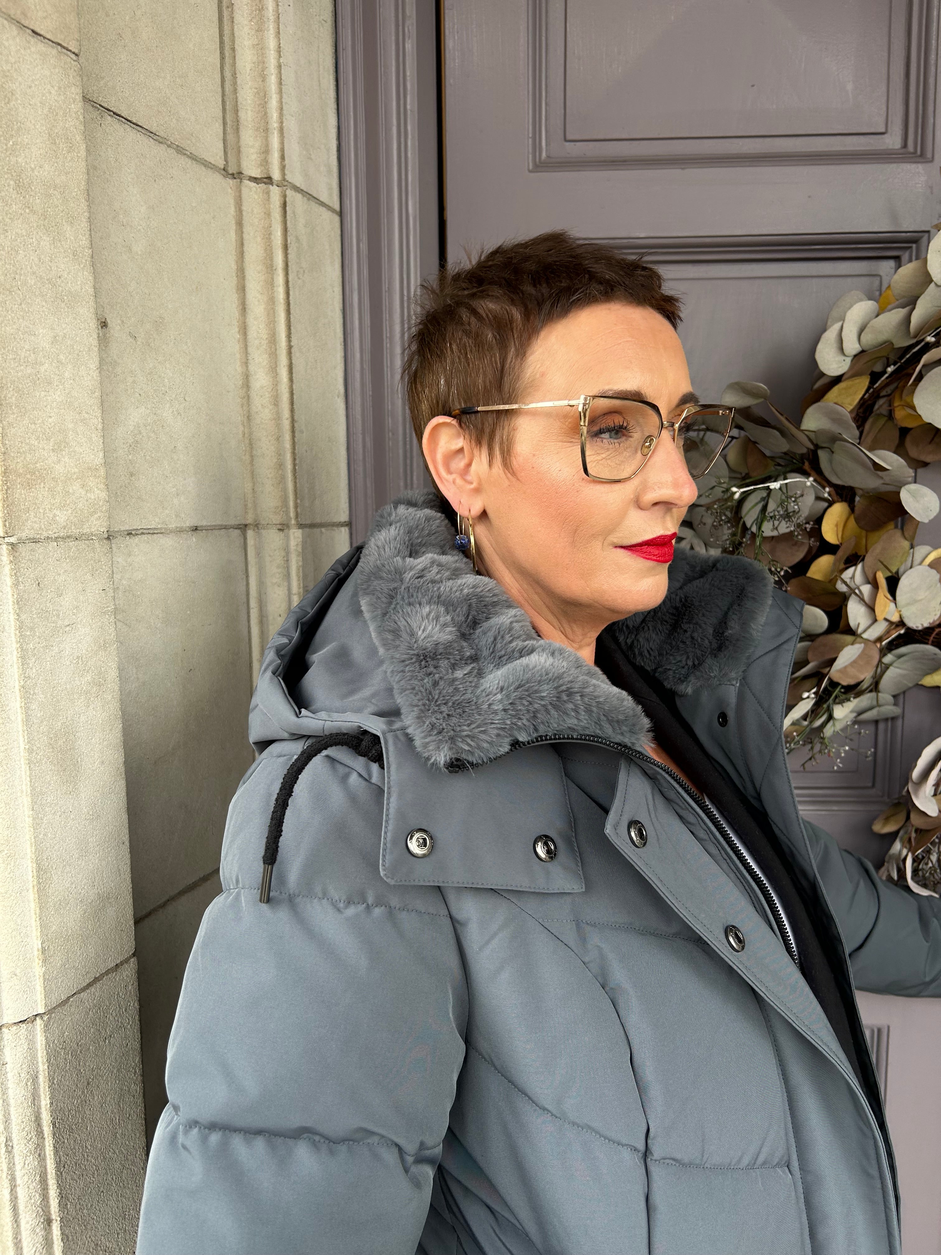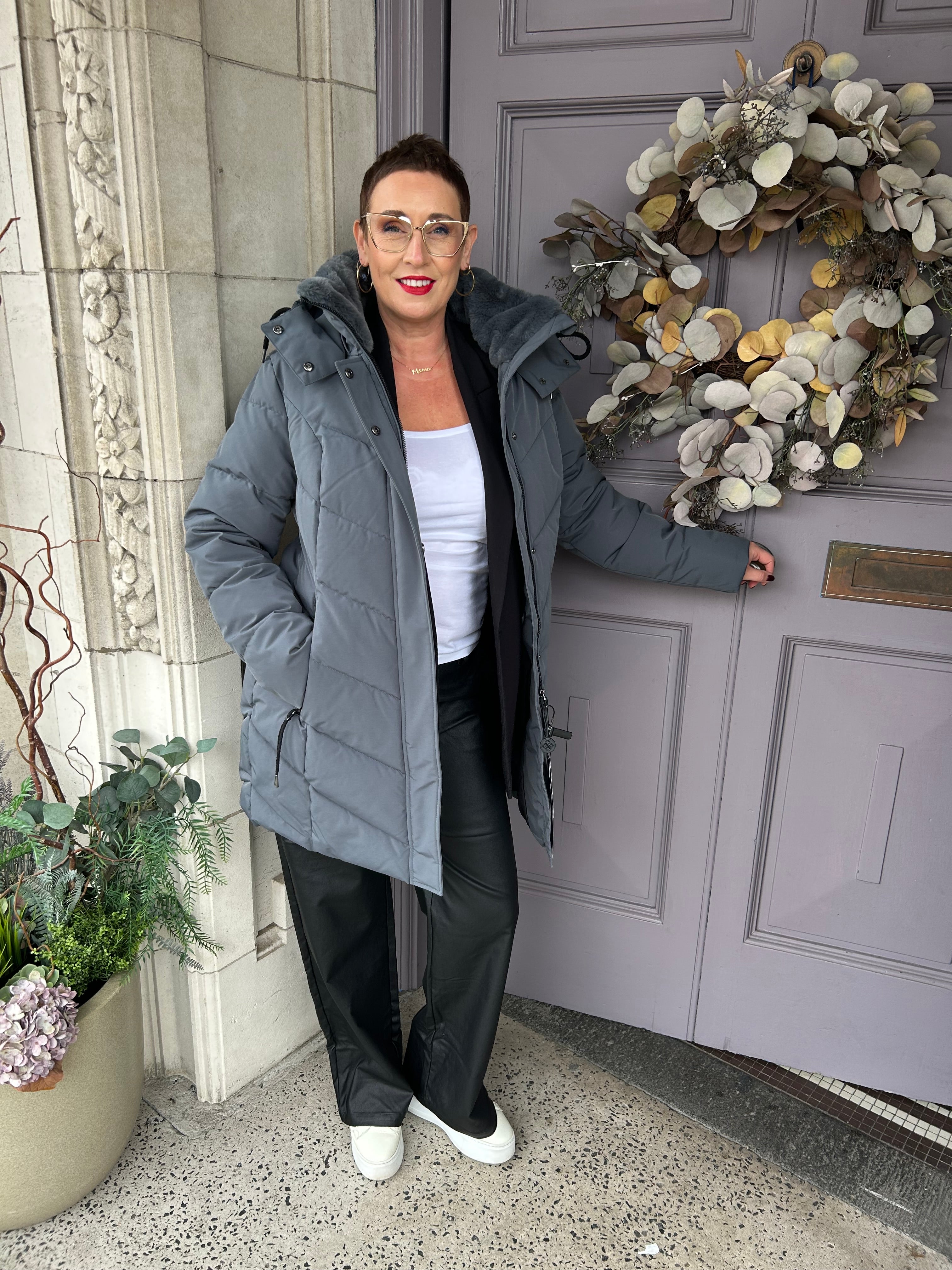 Padded Hooded Coat with Knit Cuff in Taupe/Black