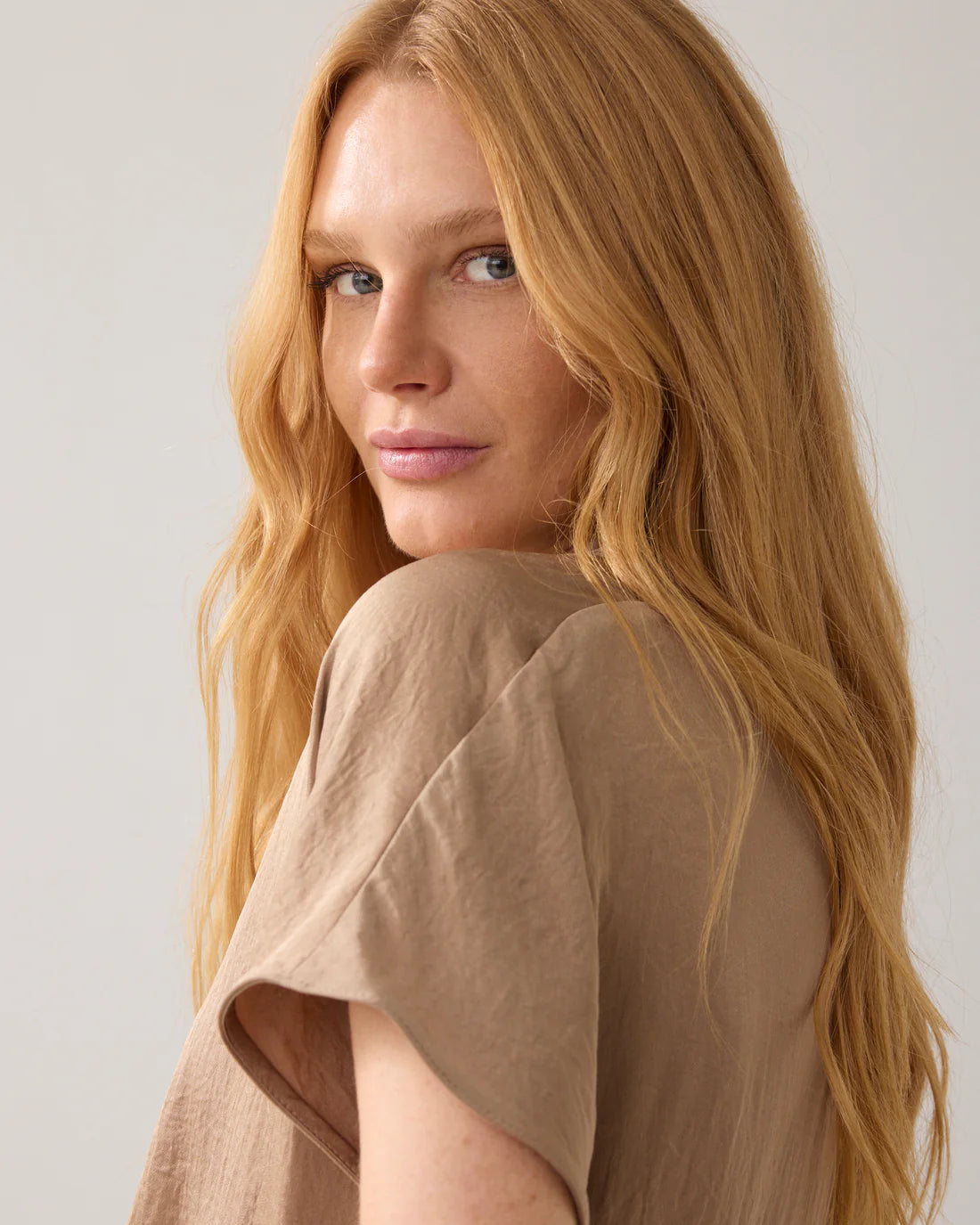 Shiny V Neck Top in Khaki